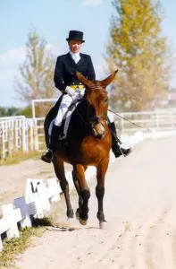 Another exercise that is helpful in lengthening the trot is to canter your equine around the arena, then cross half of your diagonal at the canter. Break to the posting trot and finish the diagonal. After the diagonal, sit the trot through the short side of the arena, pick up the canter on the long side again, and then cross the next available diagonal again and repeat the pattern. The drive that an equine gets from his hindquarters in the canter will carry through into the trot for the few strides on the diagonal and will create the true lengthening. This also holds true when teaching the lengthened walk (add trot work and back to walk) and the lengthened canter (add galloping and back to canter). This is your opportunity to tell your equine, “Yes, yes, this is what I want when I urge you on!”