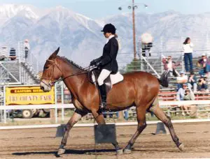The next exercise to enhance hindquarter engagement and lengthen the stride is quite simple, yet still a little tricky because lengthening your mule’s stride means covering more distance yet maintaining the same rhythm and cadence. It does not mean speed up, although that is what most equines will try to do. Track the perimeter of the arena again. This time, collect the trot on the short sides, and then urge your equine to lengthen his trot