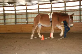 3/23/11: Rock and Roll did well during their workouts today through the hourglass pattern with 3-1” PVC poles. Rock started his workout very well with enthusiasm and balanced stops, but got sore by the end. This is to be expected with the new shoes keeping him in the same posture that he was in without them. I expect he will improve if he is able to grow sole and toe in his hind feet. The shoes should enable this as it will prevent the abrasion that was occurring from taking longer strides forward from his hips rather than the short stilted steps he was taking in the beginning. Roll was having problems doing balanced stops in the round pen, so I have decided to put him into the same hourglass pattern as Rock to improve his balance overall before going back to the round pen. I stated him in the round pen because he really needed to turn excessive fat to muscle on his body. Just putting him on a diet would not have been healthy, but walk and trot only in the round pen did help. Roll did well, but does have issues straightening his hind legs. I think changing the contour of his tendons and muscling in the hind through the hourglass exercise will help him to straighten his stance as his bones do not appear to be the cause.