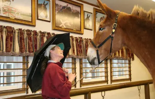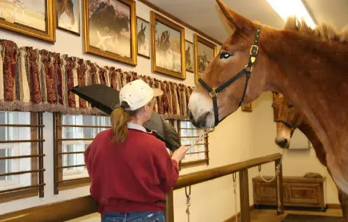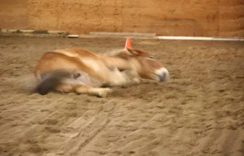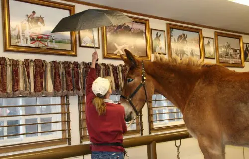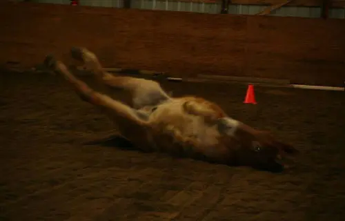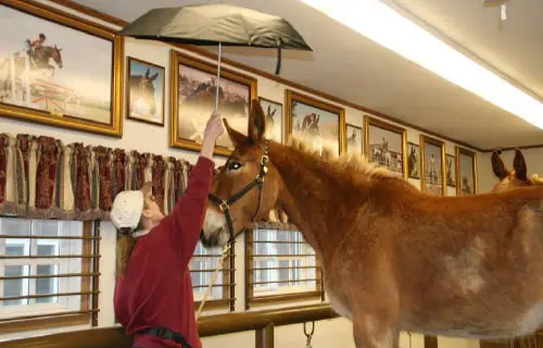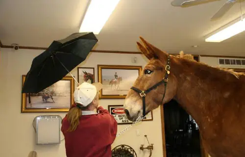 4/26/11: Rock and Roll had a good workout in the indoor arena today. We thought it would rain, so we had an introduction to an umbrella before we went out. Both mules were quite alarmed with it at first, but it only took five minutes with each of them to get them to accept it with confidence! Both mules have improved in the pattern through the circles. Rock is stepping on the poles, so I may add a 2” pole next time and see if that helps to get him to try to lift his hind legs more. Roll’s trot in the round pen is much improved. Both boys are now being asked to stretch after their workouts.