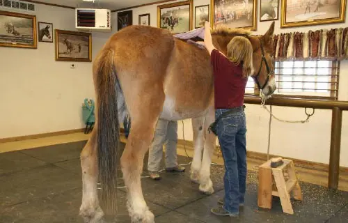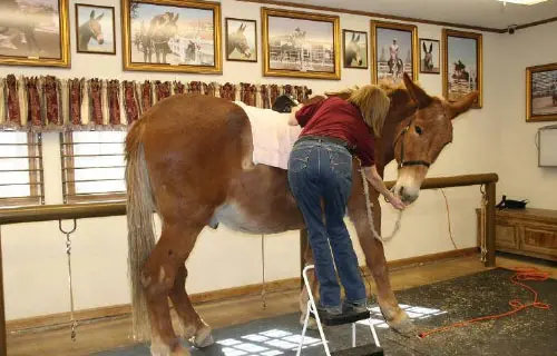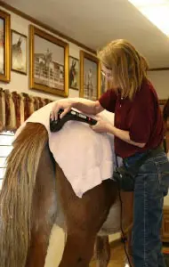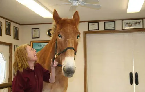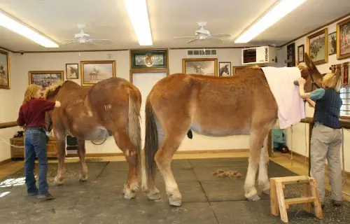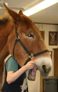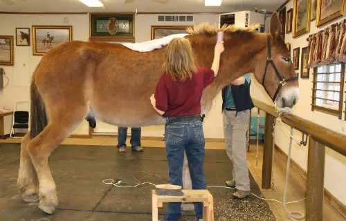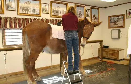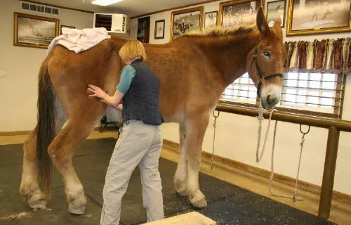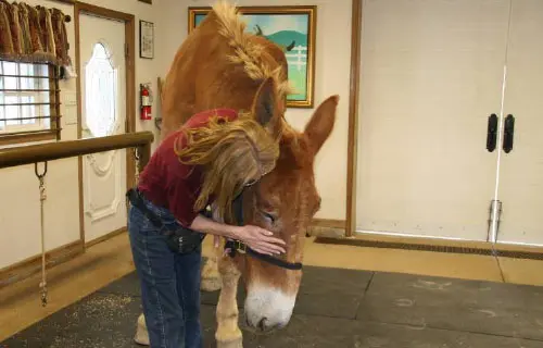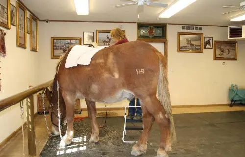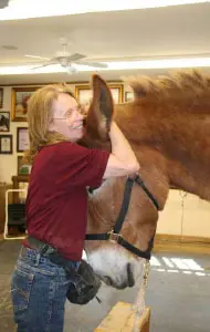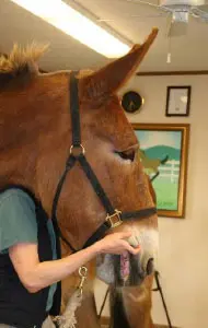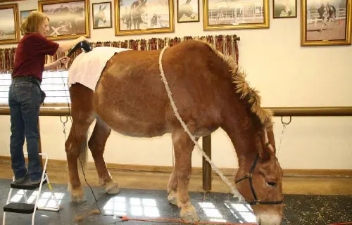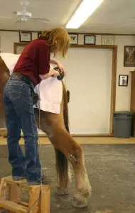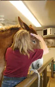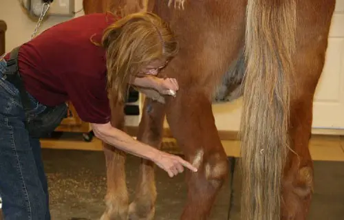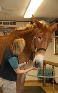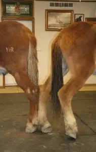 4/28/11: Rock and Roll enjoyed their massages today. Rock is getting much more interactive about his head and Roll is improving in his workout already with the massage work Joanne did on him the week before. Roll was not getting the intense work to start with because Rock was so much worse off than he was, but it soon became apparent that he needed more attention as well. His trot has much improved in the round pen and he is now able to stand squarely. Both animals had a chiropractic visit on April 21st. Both have better range of motion in their head and necks, though Rock can stretch farther than Roll right now. They both have hock sores on the left hind from getting up and down and I would expect this will improve as their strength increases. It is just great that they feel strong enough to even get down to roll this often! I am now treating them with Panalog cream once a week.