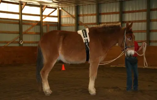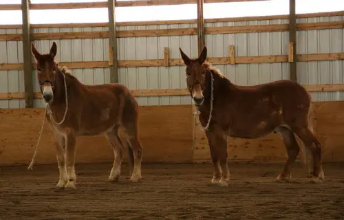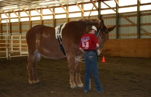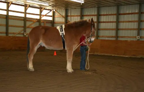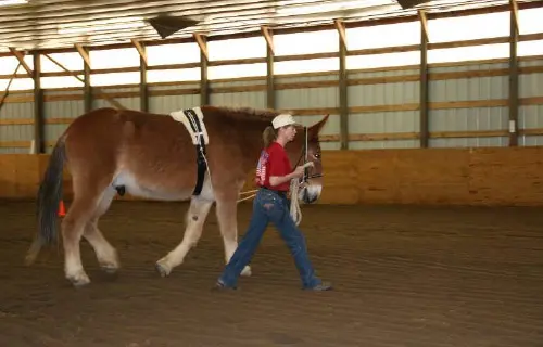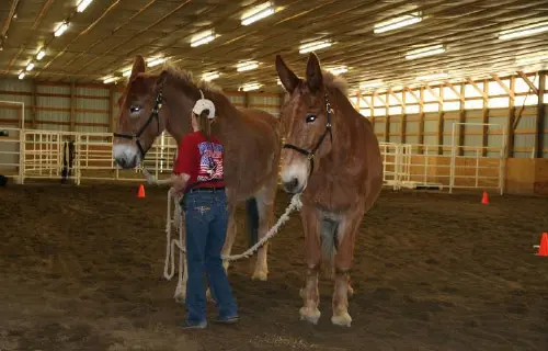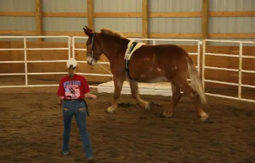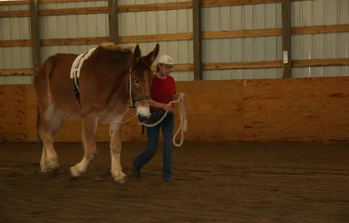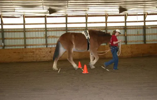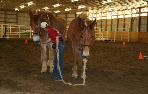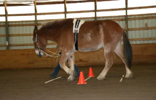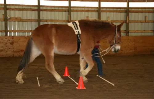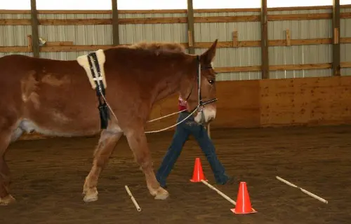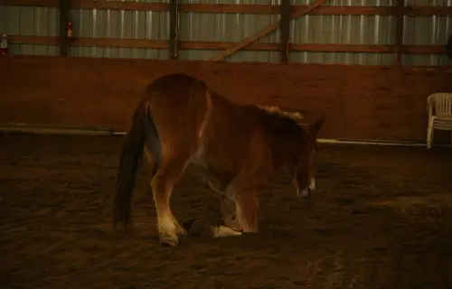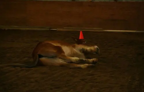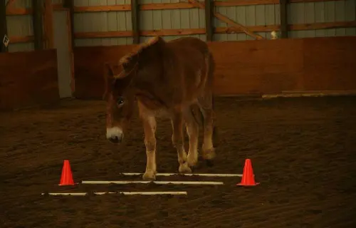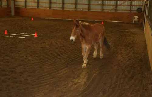 4/5/11: The wind was really blowing today and both mules were a little nervous during the grooming session. Rock was a bit sore during the workout, but while Roll was doing his workout, Rock got a little frisky and was playing in the main arena when I took Roll to the round pen. Rock rolled with enthusiasm. He did a few strides of canter and a fairly substantial buck! He even took a stroll by himself over the ground rails! Then he took a large bite out of the plywood by the gate! Though they didn’t do perfect setups and straight lines between the cones, they were both very obedient and are taking full responsibility for setting their feet with mostly verbal commands now and very few cues from the lead rope. Roll is much improved in his stride, particularly over the ground rails. He is now offering a more fluid stride-over in place of his coiled-spring action in the hind legs. Roll’s trot in the round pen has improved after his hourglass pattern work for the last few weeks. Roll was a little lazy about trotting down centerline and did it on the third try, but I had to use my camera person behind with a whip to get him to move. Rock offered a nice trot down centerline over the rails today and both mules, though a little sore, seemed very happy in their work.