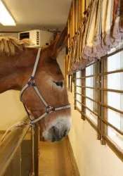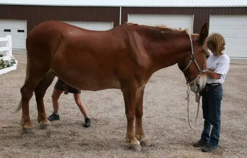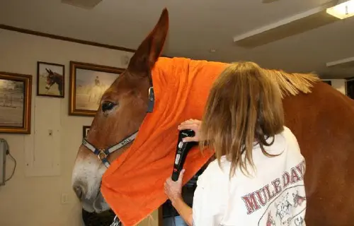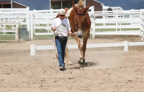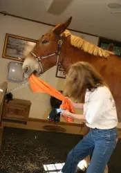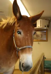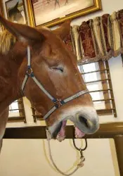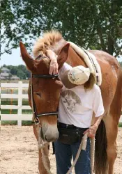 9/26/11: Rock and Roll did their respective workouts through the hourglass pattern in the hayfield on the harder flat surface today. At first, both mules didn’t realize they were supposed to do the hourglass pattern in the hayfield, so it took a few times around the cones to get them to pay attention. Rock seemed to have less difficulty with the poles with his booties on out of the sandy arena. I suspected this and wanted to relieve him a little so he would stop the paddling. It did seem to work. Then I ground drove him through the pattern and he did very well, taking an even contact on the lines and stepping with a rhythmic and regular gait. Roll did well through the pattern on the lead line, but did get a little lazy in spots. When he was ground driven, however, he had difficulty taking an even contact on the lines which made his gait very irregular and snaky. Roll is still lacking adequate forward impulsion. When I tried ground driving them together, Roll’s irregularity spooked Rock off to the side even though Steve was leading Roll from the near side. To end the session on a good note, I removed Steve from the near side of Roll (on Rock’s left) and stood between the two of them and led both while Kristen held the lines behind. That worked fine and we ended on a good note, but since Kristen was driving, there are no pictures, only video.