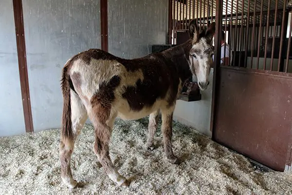 Chasity does have issues, but will be fed and maintained the same way we do with all of our equines. Many feeds can cause hypertension in Longears (and horses, too!) and an inability to focus for any length of time. Mules and donkeys require a lot less feed than horses because they are half donkey and donkeys are desert animals. Too much feed or the wrong kind of feed and you run the risk of skin irritations, abscesses, colic, or founder. The formula for our oats mix fed once a day with grass hay morning and evening is very simple and produces amazing results. Depending on the individual, we feed the average sized equines (13 hands to 17 hands) 1-1/2 to 2 cups of oats mixed with 1 oz. of Sho Glo by Manna Pro and 1 oz. of Mazola corn oil. Draft animals (over 17 hands) get twice as much and the minis get 1/4 (small minis under 36 inches) to 1/2 (36 to 48 inches) cup. We monitor weight gain and loss by decreasing and increasing the their hay intake and turnout time. A maximum of 2 cups of oats for an average sized animal (usually during the winter) is all they need. We give them oats as rewards from a fanny pack around our waist during their lessons when they actually need the added energy. The oats must be broken open in some way (crimped, steamed, rolled, etc.) as equines cannot digest whole oats. A neglected animal with coarse hair will show a drastic difference in the hair coat within four days. This feed and exercise program together will make a dramatic change in the overall body shape within six months!