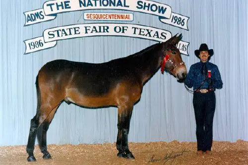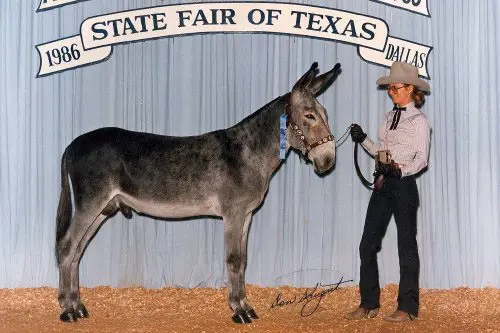 The 1986 A.D.M.S. National Donkey & Mule Show was held in Dallas, Texas, October 24-26, and hosted by the Southwestern Donkey & Mule Society. Glen Heiney, owner of the Heiney Training Center in Joshua, Texas, who has devoted his life to the advancement and promotion of the equine industry, was the chosen mule judge. Dr. Suzy Schoener, member of the A.D.M.S. since 1976 and founding member of the Texas Draft Horse & Mule Society, took time from her veterinary practice in Mansfield, Texas, to come and judge the donkeys. There were 70 different classes in the show, equally divided between mules and donkeys. This is one of the few shows I have attended that gave donkey owners an opportunity to exhibit their abilities. One need only try to train a donkey to really appreciate the patience and effort these donkey owners have put into their animals. They deserve a place to display their talents. This was one of the primary reasons we travelled all the way from Colorado to attend this show. This was one of the few shows where we could show our jack, Little Jack Horner at more than just halter. Another important reason for attending was to meet those in Texas who share our interest in Longears and what an hospitable group of people they turned out to be!