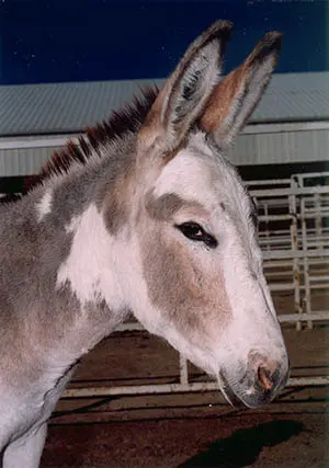 As far as a donkey’s hoofs are concerned, the expression, “No foot, no donkey” is literally true. Faults such as buck-kneed, calf-kneed, tied-in at the knee, round bone, short straight pasterns, coon-footed, too-long cannon, sickle hocks, splay-footed, knock-kneed, bowlegged, pigeon-toed, broken forward or backward feet, or too straight through the stifle and hock are all serious faults and should be avoided when breeding. Being slightly cow-hocked behind can be overlooked, as this usually increases maneuverability. The hoof itself should not reflect a ribbed appearance — it should be smooth and inclined to look sleek and oily. Even on the donkey, the hooves should not be contracted, but well-sprung (although less sprung than a mule or horse), and supported with a well-extended, healthy frog. Donkeys have a multi-layered hoof wall that will shed off in the event of mild or even severe trauma to the coronet or hoof wall, so many donkeys exhibit a “peeling” or “scabbing” of the hoof wall. A jack with this damage to the hoof should be inspected carefully to determine the severity of the problem and the extent of