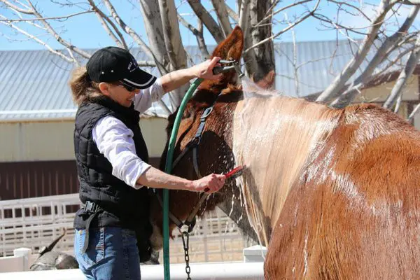 Finally a day came that was warm enough to be able to wash the winter dirt out of Roll’s mane and tail! The first thing was to make sure he did not “feed on his lead rope” while I wasn’t looking, so I removed the rope lead and attached him to the chain lead at the wash rack.