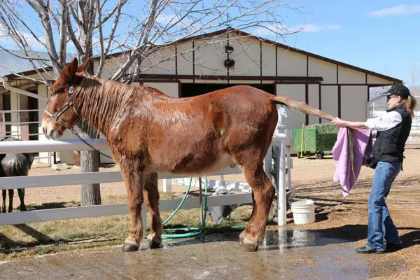 Keep an eye on the pressure you apply whenever using these various grooming tools. Different animals will have different sensitivity to these tools and will tolerate them better if they know you are not going to cause undue pressure or pain. Learn to brush the mane and tail starting at the bottom and working upward, and use a conditioner such as baby oil to keep from pulling or breaking the hair. (Baby oil will also keep other equines from chewing on the tail.) A shedding blade can be an uncomfortable grooming tool when used improperly. When using a shedding blade to remove mud around the head and ears and even on your animal’s body, be careful to minimize his discomfort by monitoring the pressure you apply to each area and working VERY slowly. When bathing him, be extra careful not to get water in his eyes or ears. These types of consideration for your equine’s comfort will help build his trust and confidence in you, and it will help make training easier and more enjoyable for both of you.