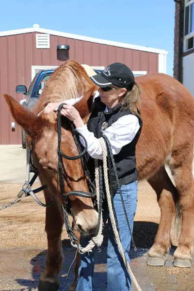 When working around your equine at the work station, pay special attention to his body language. If he becomes tense or skittish, acknowledge his concerns with a stroke on his neck, supportive words to him and a reward of crimped oats when he settles down. Always learn to wait for him to settle down before you proceed.