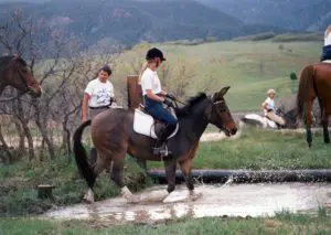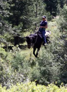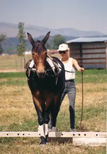 It is because I have trained my mules in this sensitized way that I once avoided going over a 100-foot drop up in the Rocky Mountains while on a trail ride. On that particular day, I was in front, riding my mule, Mae Bea C.T. with four horses behind us. When we came to a giant boulder semi-blocking the trail, I told the people on the horses to wait and rode ahead. I soon found that the trail had narrowed to an impassable two feet wide and a rockslide had wiped out the trail ahead completely! It was straight up 100 feet on one side of the trail and straight down 100 feet on the other side and there was no going forward. The horses behind me were still on the wider part of the trail on the other side of the boulder and were able turn around, so they were safe, but backing my mule around the boulder on that treacherous trail would be very dangerous. I thought we were stuck. At that point, my mule calmly looked back around at me as if to ask, “Well, Mom, what do we do now?” I thought for a minute and then shifted the weight in my seat toward my mule’s hindquarters. This movement from me allowed her to shift her weight to her hindquarters. Then, with pressure from my right leg, she lifted her shoulders, pivoted on her left hind foot and performed a 180-degree turn to the left on her haunches, and with her front feet in the air, she swept them across the open precipice of the cliff and turned us back around to face the wider (and safe) part of the trail. After completing the turn, she stopped again, looked back at me to see if everything was okay and waited for my cue to proceed back down. I believe, without a doubt, that my mule’s incredible and calm response to a life-threatening situation was the direct result of the sensitized training methods I used that created our unbreakable bond of trust.