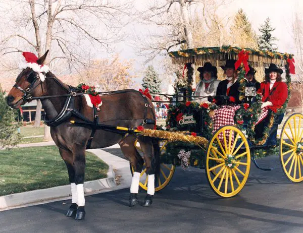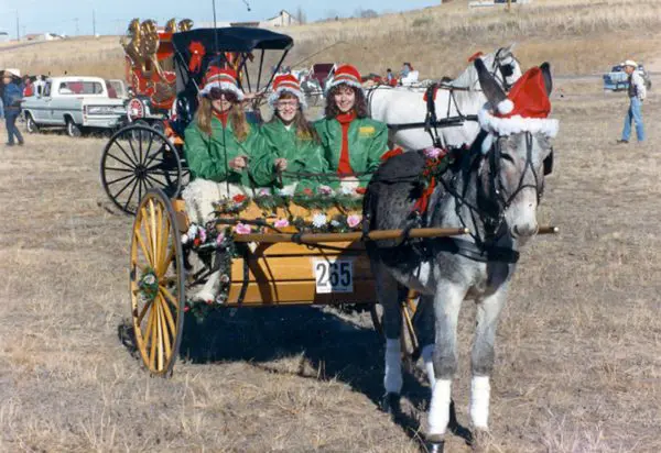 My equines have also been involved in many Christmas parades throughout the years. We would always decorate our surrey (pulled by Mae Bea C.T.) and our Meadowbrook cart (pulled by Little Jack Horner) with the most elaborate decorations! It was so much fun to hear and see the crowds of people along the parade routes waving and cheering in appreciation of our efforts. On Christmas Eve, a group of us would often go Christmas caroling throughout the neighborhood in our mule- and donkey-drawn vehicles.