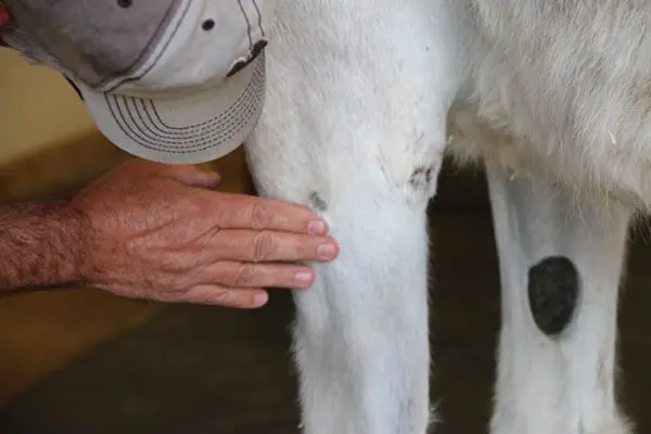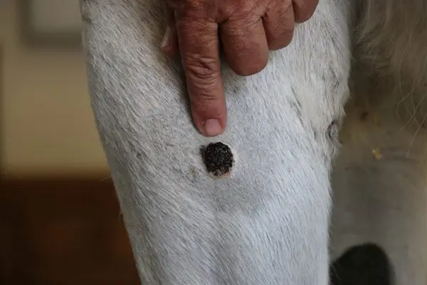 In 2011, Rock had a sarcoid on his neck in front of the withers where there was a lot of fatty tissue and the skin was loose enough to pull the sarcoid away from the body. So, we shaved his neck and removed the sarcoid with surgery. We then had it biopsied to find it was not a serious sarcoid (Better to be safe than sorry!) and it eventually just went away. In the eighties, if we removed a sarcoid, it would have had a follow-up of injections to be completely rid of it. in the nineties, veterinarians discovered another way to treat sarcoids that involved taking a piece of the biopsied sarcoid and reintroducing it as an implant in the neck to prompt an immunity response. Before he could remove one of three sarcoids the from Lucky Three Eclipse, he rubbed one and tore it open. Before we had the chance to biopsy one of the sarcoids for an implant, as if a miracle, his immune system was stimulated by HIM, kicked in and all three sarcoids just disappeared…and no, they were not anything else.