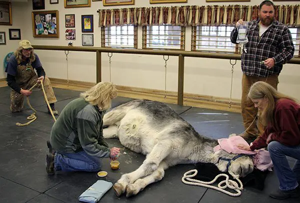 Kim prepped the area while Steve held the rope that was anchored around his hind leg to prevent any kicking if he began to wake up. Chad held the IV drip while I watched his head for unnatural breath and movement. But Wrangler just snored!